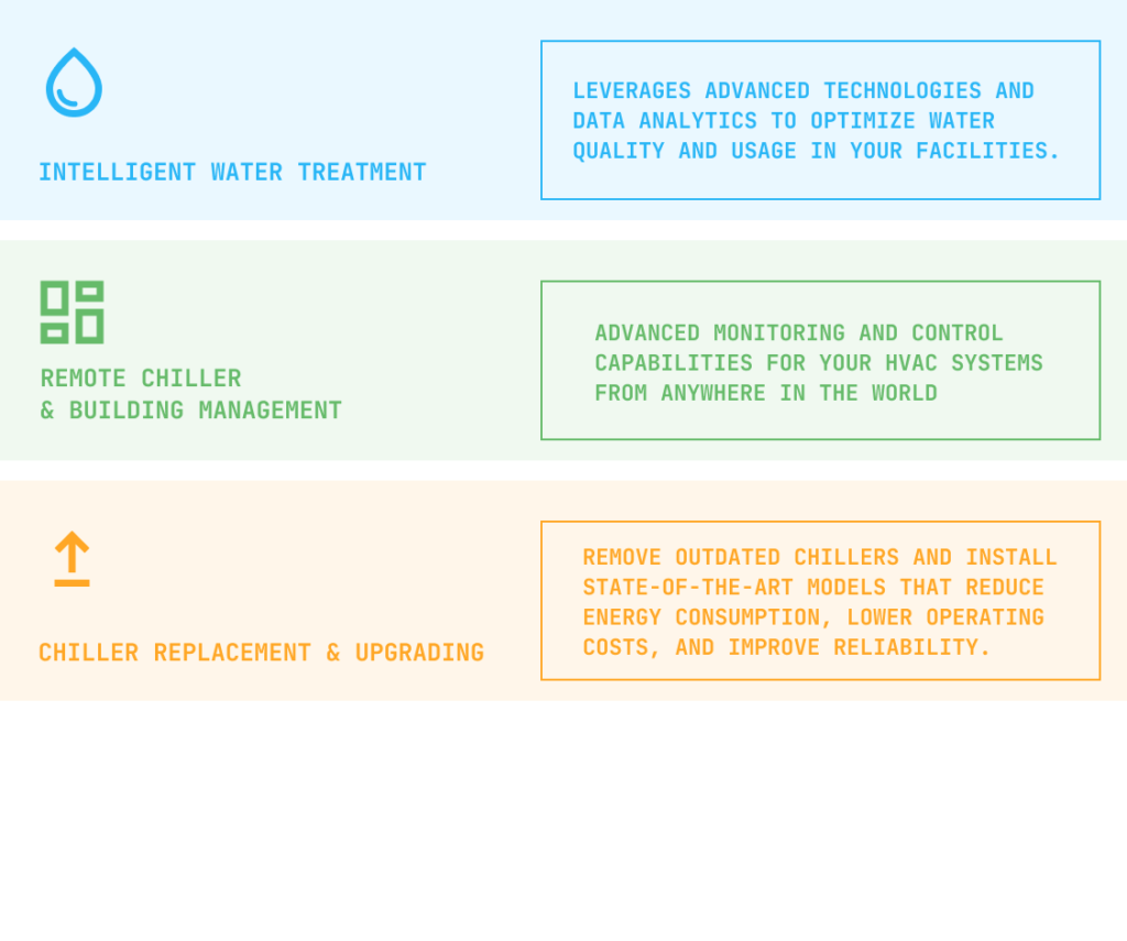 Our Featured solutions include Chiller Replacement & Upgrading for enhanced efficiency, Remote Chiller & Building Management for real-time monitoring, Intelligent Water Treatment for optimized water quality, and System Optimization & Machine Learning to improve operational performance. Together, these features offer a smarter, more efficient way to manage your facilities while reducing costs and promoting sustainability.